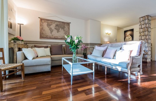 This is a beautiful elegant apartment with hardwood floors, completely renovated, with air conditioned. There are 3 bedrooms: master bedroom with king-size bed and private terrace/ patio, second bedroom with two twin beds that can become a king-size bed and with direct access to the big terrace, a third bed can be added, the third bedroom with two twin beds that can be joined . There is plenty of closet space, ideal for six , yet can sleep seven people. It has two bathrooms, with 2 new large showers, a fully-equipped kitchen, open plan dining and living area, and a wonderful terrace where you can enjoy dining and sunbathing. The large wraparound terrace is furnished with dining table, eight chairs, and four long chairs.