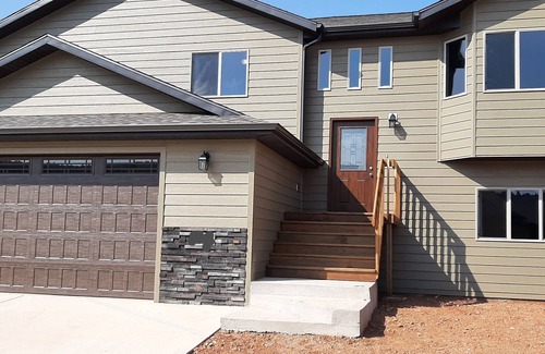 Beautiful home with a hillside view in Sturgis, SD. Our home is a split level with four spacious bedrooms and three bathrooms. It has a full kitchen with new appliances, an island with two to three seats, and a table that seats six. It also includes a living room upstairs with a queen size sofa bed, family room with a queen size sofa bed, and laundry room down stairs.