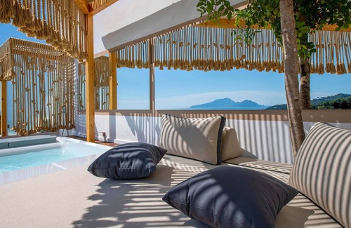One of its main features, is the amazing 180° view which can be enjoyed both from the living room and from the large private terraces. Also stunning view of the Island of Capri can be enjoyed while comfortably lying down and resting. Visitors are struck by the contrasting dazzling white of the house and the bright blue sea which creates a perfect atmosphere after a long day’s trip.