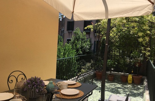 The apartment is located in a strategic position, but not crowded with tourists. The area is quiet close to Zattere, Campo Santa Margherita, the water buses, restaurants. The house is facing increasingly sunny and airy, has a beautiful terrace overlooking a beautiful little square and a private garden. The apartment has just been restored with great care and is equipped with everything that you want. And 'an annex of another apartment that you can see on Homelidays: 6268389 where you can read many reviews on our hospitality. The house gives on the garden and communicates that apartment across the terrace, which is half of a house and half the other. When the houses are rented separately, the gate that connects is closed and a jasmine flower box maintains the privacy of each. The house is full of light, with a magnificent fully equipped kitchen and a beautiful room. Two bedrooms, one overlooking the small square and the other with a glass door that opens onto the terrace. There is a sofa bed in a very comfortable room. The great green room, plastered with mosaic and wallpaper, overlooking the garden. Its entry is independent, easy to reach from the room and the room green bedroom without disturbing anyone. The other bathroom blue gives the celestial room. The house faces the sun, and it is always lit and warm in winter. The air conditioning allows you to enjoy the light to cool in summer. You can comfortably eat in the newly furnished terrace with large table.