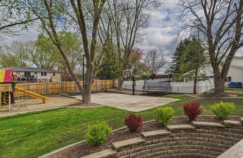 This 6-bedroom house in Sioux Falls is perfect for your escape to the city. With 1 king bed, 4 queen beds, 5 twin beds, and 1 bunk bed, this fantastic property offers plenty of space for all guests. Enjoy amenities like WiFi, a washing machine, AC, and heating. Movie theatre room. Sports court for basketball, volleyball, tennis, and more. Rainbow playset for the little kiddos. Double lot with huge wrap around deck. The 4 bathrooms feature a bathtub and shower for your convenience. Our place will help you feel at home while you're traveling in Sioux Falls.